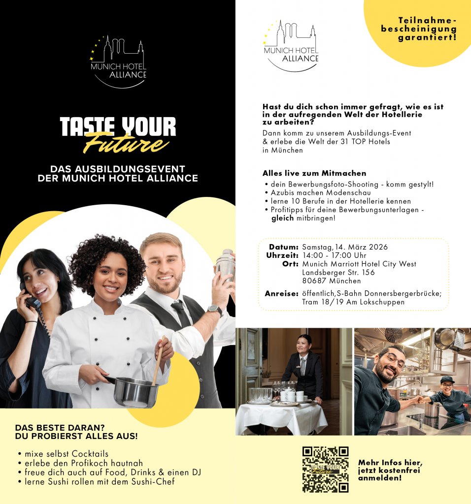 Die Munich Hotel Alliance, ein Zusammenschluss der führenden Luxus- und First-Class-Hotels in München, freut sich, an den Erfolg der vergangenen Jahre anknüpfen zu können: Der »Taste your Future Day 2026«, das interaktive Job-Tasting-Event der Münchner Luxushotellerie, das vor wenigen Wochen von der Deutschen Hotelakademie mit dem Hospitality HR Award ausgezeichnet wurde, findet auch in diesem Jahr statt: Am Samstag, den 14. März von 14 bis 17 Uhr präsentieren die 32 führenden Hotels in München in Kooperation mit der Praxis orientierten IST-Hochschule für Management ihre Ausbildungs- und Karrieremöglichkeiten.