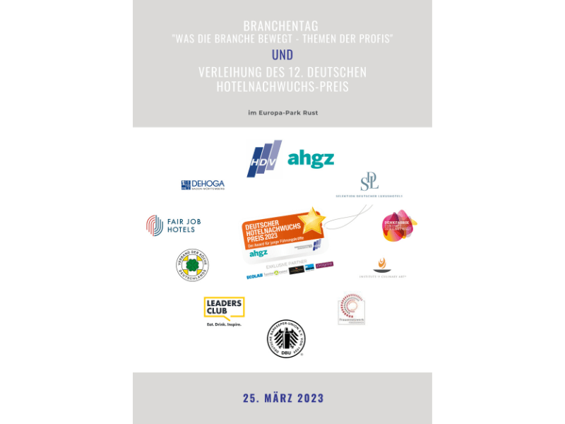 Ein weiteres Highlight des Branchentages ist die Verleihung des 12. Deutschen Hotelnachwuchs- Preises. Er wird alljährlich von der HDV und der ahgz vergeben, um Nachwuchsführungskräfte zu fördern und vorbildliche Karrieren in der Hotellerie zu würdigen. Gesucht werden junge Hoteltalente mit Führungsverantwortung in der zweiten oder dritten Führungsebene, die sich für den renommierten Preis bewerben können. Eine Fachjury trifft die Vorauswahl und nominiert drei Finalisten. In diesem Jahr präsentieren sich die Endrunden-Kandidatinnen und -Kandidaten allen Netzwerkpartnern des Branchentages, die gemeinschaftlich über den Gewinner oder die Gewinnerin abstimmen. Als Hauptpreis winkt ein Sommerkurs an der angesehenen Cornell University in den USA. Darüber hinaus vergibt die IST-Hochschule für Management eine berufsbegleitende Weiterbildung„Bachelor Hotel Management“ (alternativ auch als Master). Weiterhin erwartet den Sieger oder die Siegerin eine einjährige beitragsfreie HDV-Mitgliedschaft. Die Zweitplatzierten nehmen an einem individuellen Management-Training an der Hotelschool The Hague im niederländischen Den Haag teil. Alle Finalteilnehmer erhalten eine Einladung zur Gala „Hotelier des Jahres“ und zum Deutschen Hotelkongress 2023 in den Europa-Park in Rust. Die Preise haben einen Gesamtwert von 25.000 Euro.