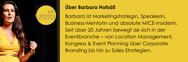 Barbara Hofsäß ist CEO, Gründerin und Consultant von justbarbara.de und kennt die Marketing-Herausforderungen der MICE-Branche wie kaum eine andere. Ihr Ansatz ist so klar wie konsequent: Erst verstehen, wer der Kunde ist und was er wirklich braucht – dann kommunizieren. Mit ihrem Konzept BoostMe MICE gibt sie Unternehmen keine fertigen Kampagnen an die Hand, sondern eine praxisnahe Gebrauchsanweisung für Marketing & Sales.