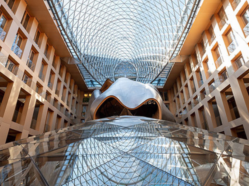 Ausgefallenes Design definiert die Atmosphäre der Eventlocation: die Ruhe und Schönheit der weiten Arkadengänge und die Leichtigkeit der Glasskulpturen im Forum, welches Platz bietet für bis zu 500 Personen, dazu die Dynamik eines roten Teppichbodens auf einer Fläche von 900 qm – Raum für Ihre ganz individuellen Veranstaltungen.
