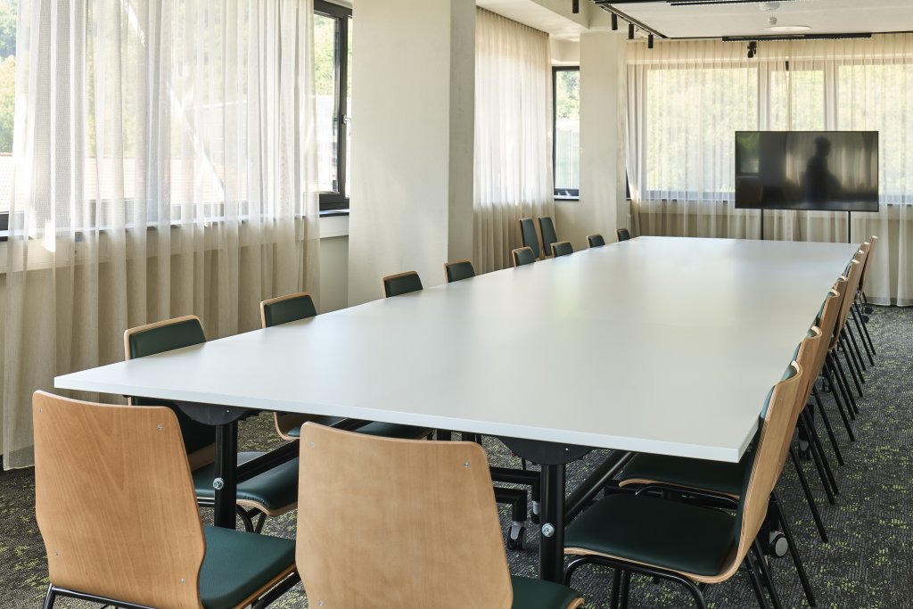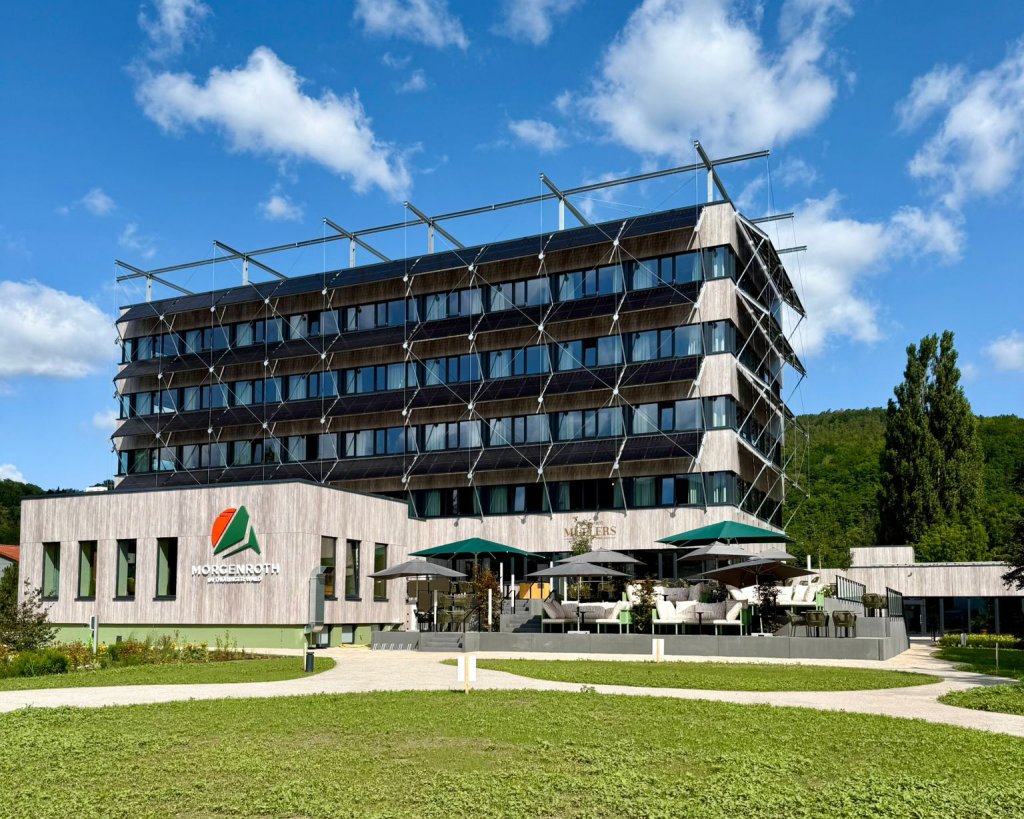 Wenige Täler weiter zeigt das Hotel MORGENROTH, wie nachhaltig ein Tagungsort sein kann, wenn Mut und Vision zusammenkommen. Aus einem alten Verwaltungsbau wurde ein fast klimaneutrales Tagungshotel – mit PV-Fassade, smarter Gebäudetechnik und Räumen, die Ruhe und Klarheit ausstrahlen. Gastgeber Tobias Jahn beschreibt das Wesen des Hauses so: „Wir haben Altes mit Sorgfalt erhalten und mit moderner Technik neu gedacht – energieeffizient, nachhaltig und offen für Begegnungen.“